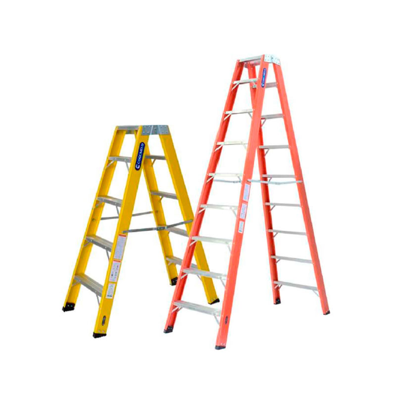 Modelo Tesoura DUPLO Acesso, com perfis em “U” em fibra de vidro e degraus planos em alumínio com frisos antiderrapante. Possui topo de alumínio, articulações em aço galvanizado com sistema antibeliscão e sapatas de borracha antiderrapante. Todos os degraus são reforçados com mão francesa, o que proporciona maior segurança.